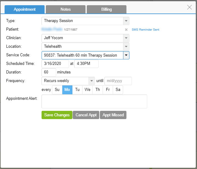 If you been using TherapyNotes for any length of time, you are probably on automatic pilot when it comes to entering progress notes. However, when you do a therapy session or intake via teletherapy, there are a couple of settings you need to confirm for the appointment in TherapyNotes.